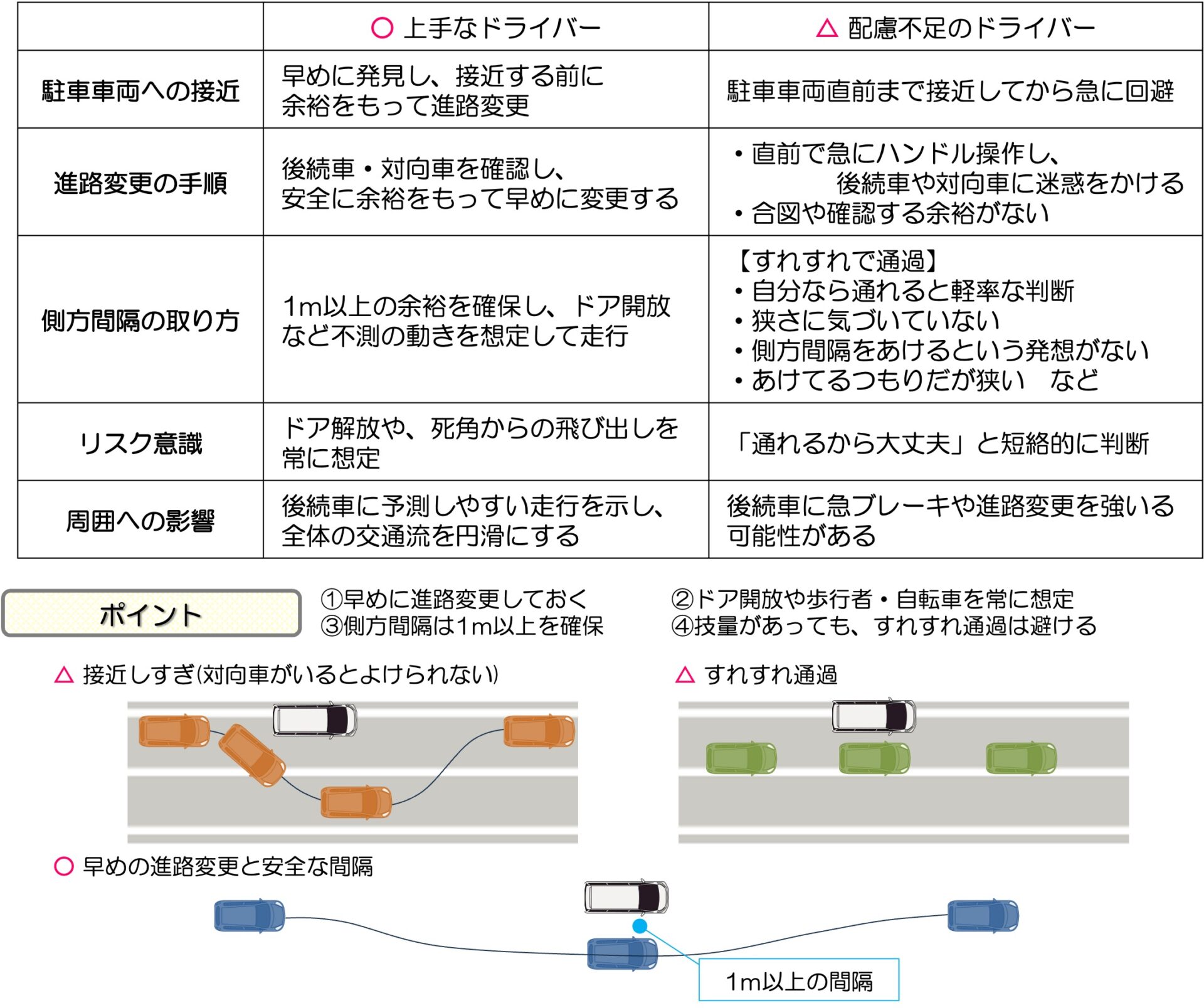 そしてこの進路変更をするときに、例えば駐車車両をよけるときの間隔が狭い場合などは、接触などの事故に繋がりやすくなります。